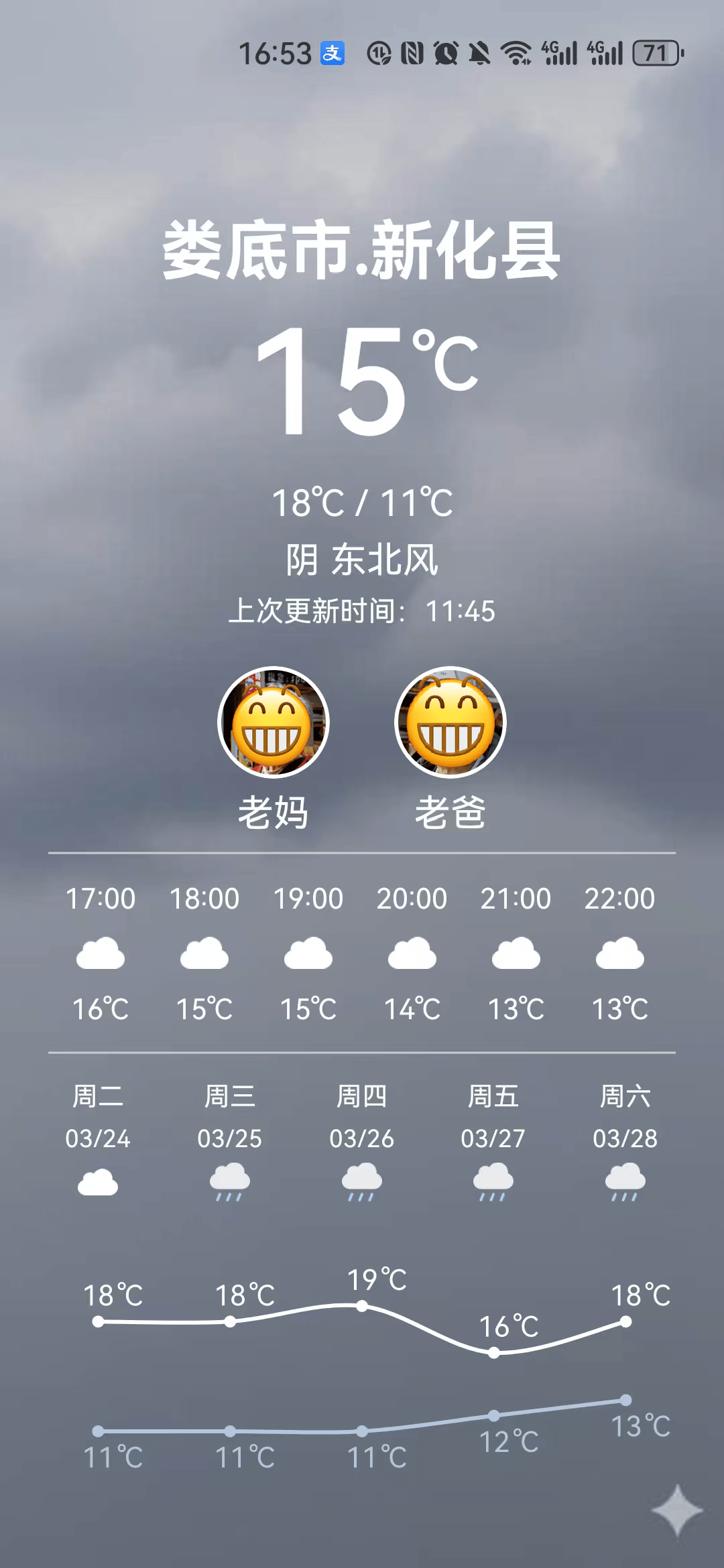 自动定位家庭成员所在城市,实时显示温度与天气状况。下雨天自动提醒带伞,降温天提醒加衣。